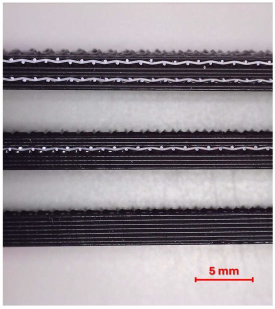 In order to ensure the same mesh grid for all six samples, firstly, the mesh structures were cut with a proper alignment using a cutting jig. During the addition, it was aligned to the 3D printer’s table by supporting it from the back edge and held with a clip, ensuring that this alignment was always constant. The distances between the samples were calculated by taking into account the number of meshes, and in this way, it was guaranteed that the mesh structures would come to all six samples in the same way. The mesh number 25 refers to the number of yarns in 1 inch. The repeating grid interval is 25.4/25 = 1.016 mm, 5 grid; i.e., 1.016 × 5 = 5.08 mm were left between the samples.