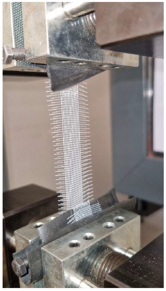 Tensile tests were performed to determine the mechanical properties of the polyester mesh structure used as a reinforcement element; an image from the tensile tests is given in Figure 3, the force/displacement and engineering stress/strain curves obtained from the tests are given in Figure 4a,b. Mechanical properties calculated using tensile test results are given in Table 4. In carrying out these tests, an extensometer could not be used as it was only suitable for standard tensile test samples and the elongation values were obtained from the crosshead movement. For this reason, while the elongation values could be evaluated comparatively, it was not possible to use them in the tensile modulus calculation.
