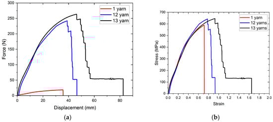 To understand the effect of the mesh structure produced via plain weaving on the tensile properties, both single yarn and samples containing different numbers of yarns were tested. Thirteen yarns represent the situation corresponding to the width of the tensile and bending samples that will be mentioned in the following sections, and the value of twelve yarns was chosen to observe whether generalizations can be made by collecting the data obtained from separate tests. In other words, the question of whether the load carried by 1 yarn and the load carried by 12 yarns can be reached by adding the load carried by 1 yarn is answered. The tensile strength values calculated using the yarn diameter are close to each other and are compatible with the literature [27,28]. Due to the interaction of the weft and warp yarns in the woven structure, the tensile strength was also affected in the direction of increase with the increase in the number of yarns in the sample. The sudden decreases in the curve observed in the experiments conducted with 12 and 13 yarns, which were not seen in 1 yarn sample, are an indication of the warp yarns breaking. The increase in the breaking elongation with the increase in the number of warp yarns is related to the interlocking of the warp and weft in the woven structure.