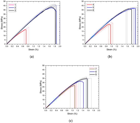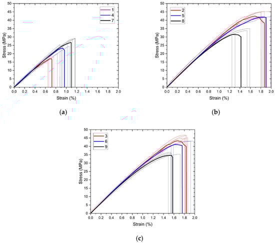 (a–c) Tensile test curves of samples grouped for the number of reinforcement layers.