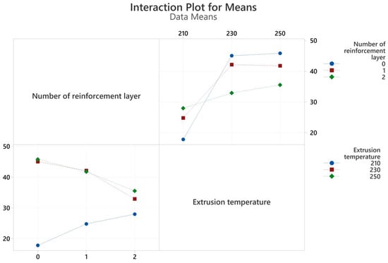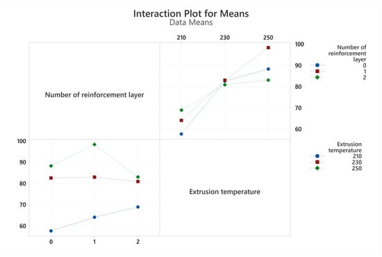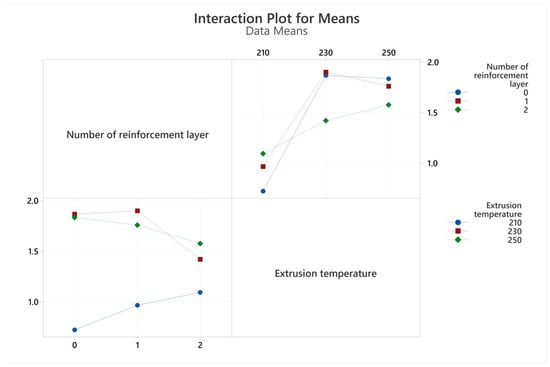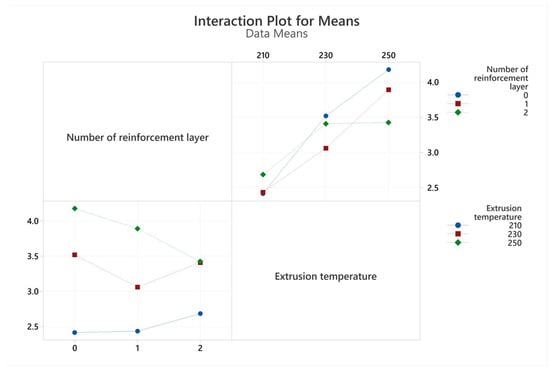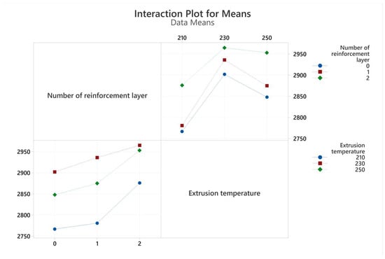 Tensile modulus values were calculated using mathematical average curves and are shown in Table 5. The interaction plot for tensile modulus values is visualized in Figure 9. The highest tensile modulus value was obtained in the two-layer reinforced sample produced at a 230 °C extrusion temperature. It should be noted that the tensile modulus increased with the increase in the number of reinforcement layers at all extrusion temperature levels. This is clearly related to the higher tensile modulus of the polyester mesh structure compared to PLA. With increasing extrusion temperature, the tensile modulus first increased and then decreased. This situation can be associated with the increase in the heat exposure of the polyester and the properties of the PLA filament going beyond the optimum values with the increasing extrusion temperature [27,30].