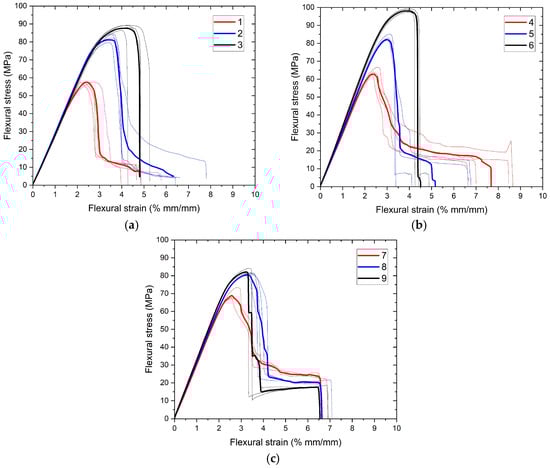 (a–c) Three-point bending test curves of samples grouped for number of reinforcement layer.
