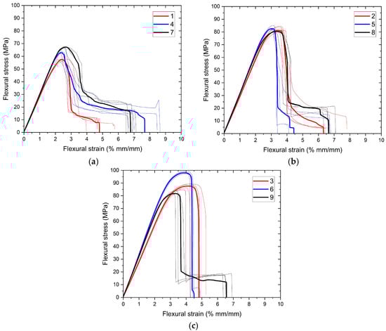 (a–c) Three-point bending test curves of samples grouped for extrusion temperature.