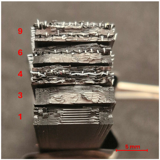 The fracture surfaces of some bending test samples are given in Figure 14. Bending stress is a stress in which tensile stresses occur at the bottom of the sample and compressive stresses occur at the top. This situation leads to different fracture behaviors below and above the neutral axis in bending samples, unlike tensile test samples. Sample number 1 showed a very brittle fracture similar to the tensile samples with the same number. The image of the bottom part of sample number 3 is an indication that it was subjected to bending stress and showed a relatively high energy absorbing ductile fracture. The samples numbered 4 and 6 show one-layer reinforcement samples produced at the lowest and highest extrusion temperatures. It is seen that the fracture surface of sample number 6, in which the bending strength of the sample increased by approximately 53% with the increase in extrusion temperature, exhibits a ductile fracture. In sample number 4, delamination occurred due to insufficient interlayer adhesion due to the low extrusion temperature [1,31,40]. Interlayer separations are visible in this sample. Sample number 9 is a sample with two-layer reinforcement and produced at the highest extrusion temperature. The fracture in this sample occurs in a ductile manner, but delamination is also observed. The gradual decrease in the flexural stress in the test curve of this sample given in Figure 6c also indicates delamination. It is also seen that the bonding of the polyester fibers with the matrix is insufficient in this sample.