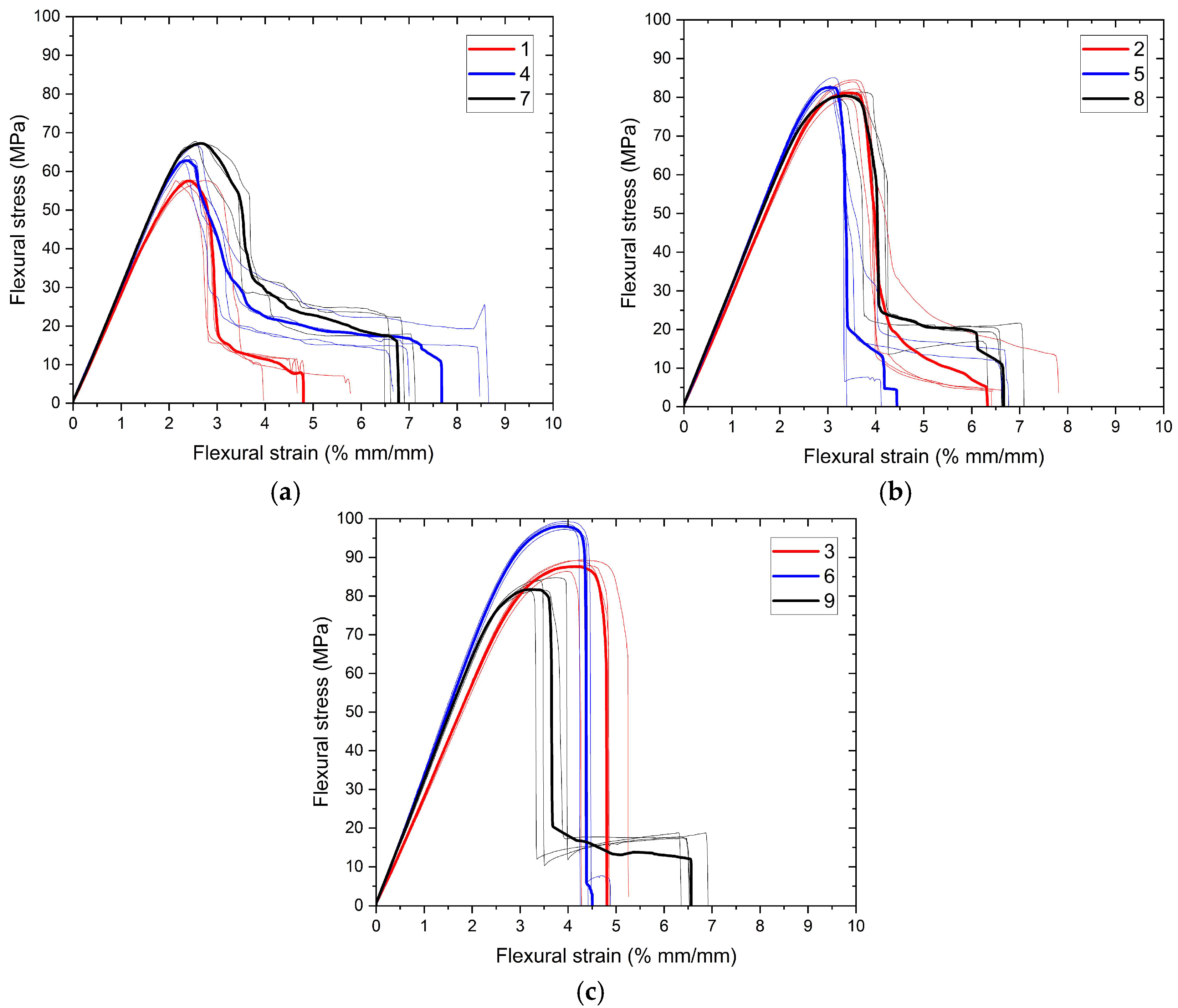 Engineering curves obtained from three-point bending tests are visualized in Figure 10 and Figure 11. As in tensile tests, figures were grouped to evaluate the effects of extrusion temperature and number of reinforcements for bending tests. To visualize the repeatability of the experiments, the averages of the experiments are also plotted (bold curves) in the relevant graphs. As can be seen, the repeatability of the experiments is quite high. This indicates that the production processes are not significantly affected by noise parameters. Flexural strength and flexural strain at the onset of failure were calculated with the obtained data and presented in Table 8 along with standard deviation values.