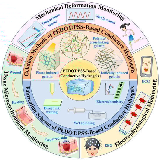 Among the wide array of conductive hydrogels, those based on poly(3,4-ethylenedioxythiophene):polystyrene sulfonate (PEDOT:PSS) have attracted considerable attention due to their superior electrical performance, environmental stability, and versatile processability [16,17]. PEDOT:PSS hydrogels can be constructed using a variety of gelation methods, as outlined in recent research: polymer crosslinking techniques, which include physical, chemical, and combined physical–chemical approaches, offer a controllable means to achieve the desired network structure [18,19,20]; ionically induced gelation leverages ionic interactions to form stable gels [21,22]; and photo-induced gelation provides spatial and temporal control over the crosslinking process [23]. Additionally, advanced fabrication schemes such as casting and molding, wet spinning, electrospinning, electrochemistry, inkjet printing, direct ink writing, and digital light processing (laser-induced) have further broadened the design space, enabling precise control over the hydrogel’s microstructure and performance characteristics [24,25,26,27,28].