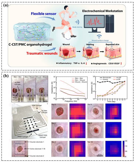 PEDOT:PSS hydrogels facilitate the real-time monitoring of biochemical fluctuations in tissue microenvironments through their ion–electron coupled conductive networks, advancing precision diagnostics for chronic wounds [60,61]. A multifunctional conductive organohydrogel (C-CST/PMC) was engineered through the synergistic integration of catechol-modified chitosan, silk nanofibrils, and tannic acid within a PVA-based binary solvent system. This material demonstrates exceptional mechanical robustness, cryogenic flexibility (−18 °C)—the ability to maintain pliability and resist brittleness at subzero temperatures due to (1) a glycerol–water binary solvent that suppresses ice crystallization and (2) dynamic hydrogen/coordination bonds that enable energy dissipation under thermal stress—autonomous self-healing, and dual antibacterial–antioxidant functionality, while maintaining high ionic conductivity across extreme temperatures [60,61]. Its bioactive interface promotes angiogenesis and suppresses inflammation in diabetic wounds, as validated by accelerated in vivo healing. Furthermore, when integrated into bionic wearable sensors, the hydrogel enables the real-time monitoring of wound recovery dynamics, establishing a closed-loop platform for simultaneous therapeutic intervention and physiological tracking in skin trauma management (Figure 6a) [62]. Additionally, Shin et al. developed an all-hydrogel electronic skin (e-skin) patch using photolithography-compatible functional hydrogels, including PEDOT:PSS-based electrodes with tissue-mimetic hydration and mechanical compliance. The hydrogel’s human-tissue-like modulus and water content ensured stable biointerfacing in dynamic physiological conditions. In murine models, the e-skin synergistically accelerated wound healing through electric field-enhanced fibroblast activity and iontophoretic drug delivery, while simultaneously mapping healing progress via impedance changes. This dual-action platform, integrating therapeutic stimulation with real-time biosensing, established a paradigm for closed-loop tissue-interfacing systems in clinical diagnostics and regenerative medicine (Figure 6b) [63].