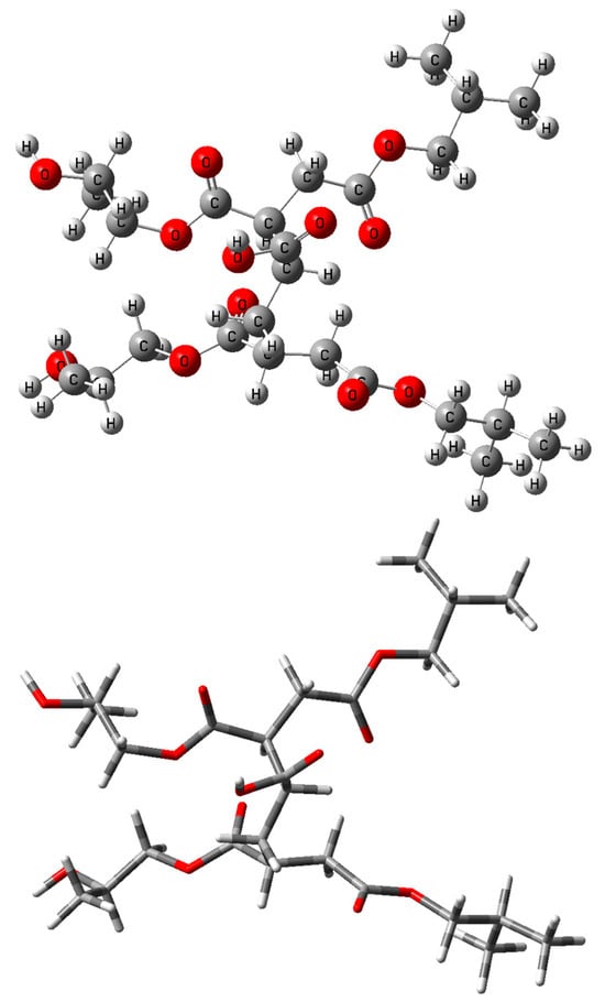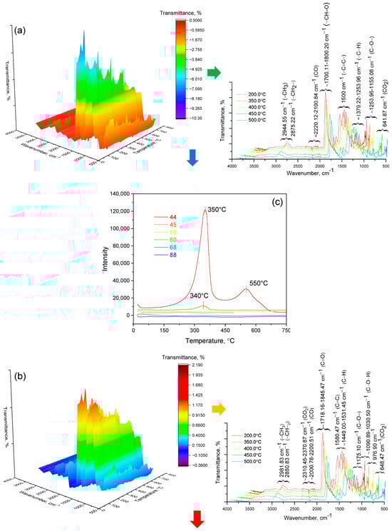 Table 1 demonstrates the correspondence between the experimental and calculated IR absorption bands of the p-PGFPh:AA copolymers, supporting the identification of structural fragments involved in thermal decomposition. For example, the band observed at 1724–1723 cm−1, which aligns with the calculated range of 1735–1700 cm−1, corresponds to the stretching vibrations of C=O groups, indicating the degradation of ester and carboxylic moieties. Vibrations in the region of 2980–2942 cm−1 (experimental) and 3020–2950 cm−1 (calculated) reflect C–H bonds in aliphatic and aromatic groups, which undergo cleavage during the initial stages of decomposition. Data on CH2 and CH3 deformation vibrations (1268–1063 cm−1) help to identify unstable segments of the polymer backbone.