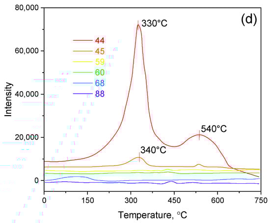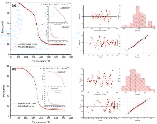 To process the results of thermogravimetric analysis (TGA), the software environments OriginPro 9.0 and Anaconda (Python 3.10 with NumPy, Matplotlib, version 3.10.1, and SciPy libraries) were utilized. The primary objective was to approximate the experimental mass loss curves as a function of temperature. Polynomial regression models implemented in polynomial models from the Polynomial Fit module of OriginPro 9.0 were used to analyze the dependencies, providing both statistical evaluation and visual representation of the results.