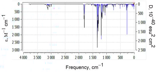 The most intense band in the experimental IR spectrum (νexp 1723.66 cm−1) is due to the valence vibration of the C=O bond in the carboxyl group. In the frequency range of 1735–1700 cm−1 of the model spectrum, signals are attributed to the vibrations of polar bonds in the carbonyl groups and the carboxyl group, with very high intensity.