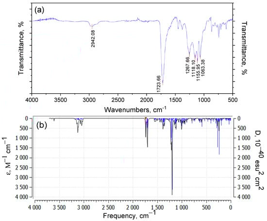 Valence vibrations of C–C bonds, changes in the valence angles of C–O–C bonds, scissor vibrations of methylene groups, and symmetric and asymmetric deformation vibrations of methyl groups are observed in the “fingerprint” region (below 1500 cm−1). In the experimental spectrum, absorption bands are present at frequencies of 1268, 1118, and 1063 cm−1, which are responsible for the aforementioned vibrations.