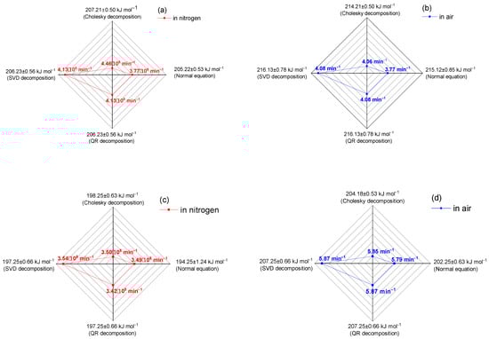 Figure 9 shows the dependence of the activation energy (in kJ mol−1) and the pre-exponential factor (in min−1) as a function of the partial peak area for different conditions and calculation methods. The red lines in graphs (a) and (c) correspond to the nitrogen atmosphere, while the blue lines in graphs (b) and (d) correspond to the air atmosphere. The results in Figure 9 show that the decomposition method affects the value of the activation energy and the pre-exponential factor, with QR decomposition and SVD decomposition improving resistance to rounding errors. This ensures the accuracy and stability of these methods in calculating dynamic parameters.