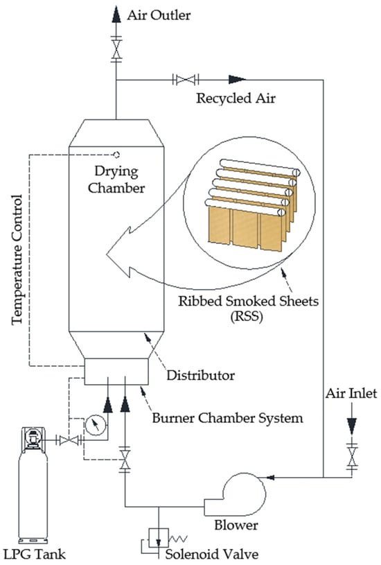 Natural rubber, also known as para-rubber, plays a crucial role in various industries, including medical, aerospace, automotive, and public health sectors, as well as in the production of protective equipment. It is a naturally derived raw material and serves as a key feedstock for food-related and chemical industries [1,2]. Para rubber (Hevea brasiliensis) is one of Thailand’s most significant economic crops, ranking as the country’s third-largest export commodity after automobiles and computers. In 2023, Thailand had 24.1 million rai (approximately 3.86 million hectares) of rubber plantations, with an export volume of 2,866,467 metric tons [3,4]. The increasing demand for natural rubber is driven by the expansion of rubber-based product manufacturing industries [4], contributing to the growth of Thailand’s rubber exports. Before export and distribution, natural rubber undergoes processing, beginning with the collection of fresh latex from rubber plantations. The latex is filtered to remove impurities, coagulated with coagulants, and subsequently rolled into raw rubber sheets. Due to their high moisture content, these sheets must be dried to a moisture level of 3–5% (dry basis) to prevent fungal growth during storage, resulting in air-dried rubber sheets.