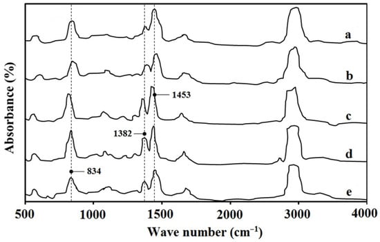FTIR spectra of NR films coagulated by (a) acetic acid; (b) formic acid; (c) para-rubber wood vinegar; (d) eucalyptus wood vinegar; (e) bamboo wood vinegar.