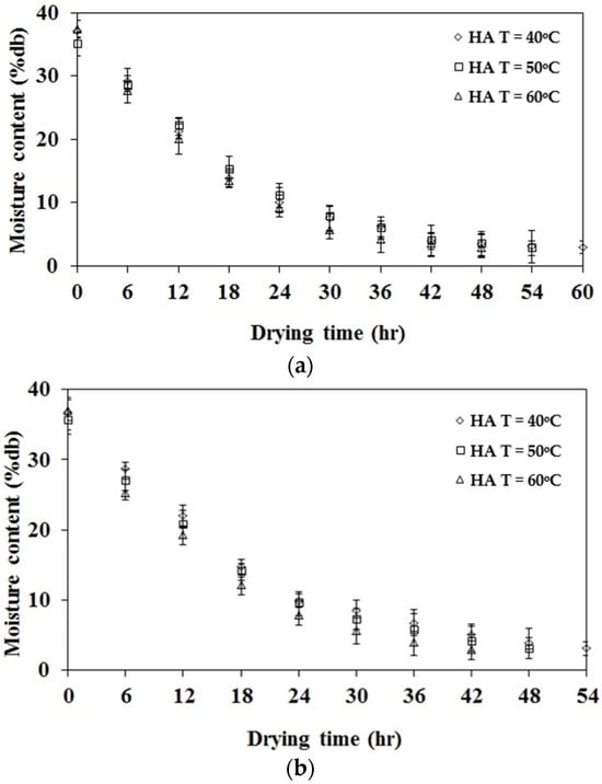 All rubber sheet samples initially had a moisture content of 35.0 ± 2.5% on a dry basis. A centrifugal fan (Nitco, model RB60-520, Hessdorf, Germany) was used to maintain a constant airflow speeds of 0.5 m/s and 1.0 m/s. The ambient temperature, along with the inlet and outlet air temperatures used during drying, was measured using Type K thermocouples. Experiments were conducted five times at drying temperatures of 40 °C, 50 °C, and 60 °C, which are considered optimal for rubber sheet drying, as previously validated and accepted by researchers [1,2,6,7,12,21,22,23,24]. The drying process continued until the final moisture content reached 3.0 ± 0.5%, in accordance with the standards established by the Rubber Research Institute of Thailand (Bangkok, Thailand) [1,5,7,21]. At each drying condition, rubber sheet samples were removed from the drying chamber every six hours to measure their moisture content using the method specified by the American Society of Agricultural and Biological Engineers (ASAE) (St. Joseph, MI, USA) [2,8,21,22,23,24].