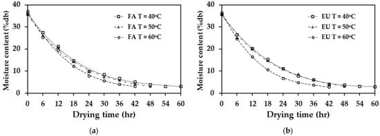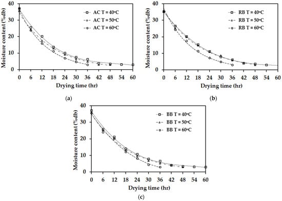 where MR, M, Meq, Mint are the dimensionless moisture ratio, the moisture content at any time, the equilibrium moisture content, and the initial moisture content in dry basis percentage, respectively.