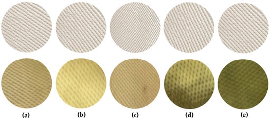 The fungal resistance of rubber sheets treated with wood vinegar derived and commercial acid (before and after drying process): (a) wood vinegar derived from para-rubber wood; (b) wood vinegar derived from bamboo wood; (c) wood vinegar derived from eucalyptus wood; (d) formic acid; (e) acetic acid.