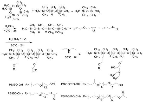 Octamethylcyclotetrasiloxane (D4, >99.5%; Dowcorning, Midland, MI, USA), polymethylhydrosiloxane (high-SiH silicone oil, viscosity 20 mm2 s−1, Mw = 2000; Dowcorning, Midland, MI, USA), hexamethyldisiloxane (HMDSO, >99.5%; Wacker Chemie AG, Burghausen, Bavaria, Germany), allyl polyethylene ether glycol (APEG, Mw = 600; Zhongshan Chemie, Nanjing, China), acetyl end-capped allyl polyethylene ether glycol (AAPEG, Mw = 600; Zhongshan Chemie, Nanjing, China), allyl polyethylene-polypropylene ether glycol (APEPG, Mw = 600, polyethylene/polypropylene = 1:1 w/w; Zhongshan Chemie, Nanjing, China), acetyl end-capped allyl polyethylene-polypropylene ether glycol (AAPEPG, Mw = 600, polyethylene/polypropylene = 1:1 w/w; Zhongshan Chemie, Nanjing, China), diethylamine (DEA, >99.0%; Aladdin Biochemical Technology, Shanghai, China), potassium hydroxide (KOH, >99.0%; Aladdin Biochemical Technology, Shanghai, China), sodium carbonate (Na2CO3, >98.0%; Aladdin Biochemical Technology, Shanghai, China), chloroplatinic acid (>39.0 wt.% Pt; Johnson Matthey PLC, Royston, Hertfordshire, UK), sulfuric acid (>98.0%; Aladdin Biochemical Technology, Shanghai, China), allyl glycidyl ether (AGE, >99.5%; Aladdin Biochemical Technology, Shanghai, China), isopropanol (IPA, >99%; Aladdin Biochemical Technology, Shanghai, China), and xylene (>99.5%; Aladdin Biochemical Technology, Shanghai, China) were used in the experiments. All reagents were of analytical grade. The solvent was distilled before use in all experiments.