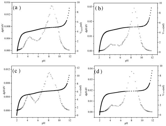 pH vs. VNaOH (solid squares) and pH vs. dpH/dV (open squares) curves of (a) PSiEO-OH, (b) PSiEO-CH3, (c) PSiEO/PO-OH, and (d) PSiEO/PO-CH3.