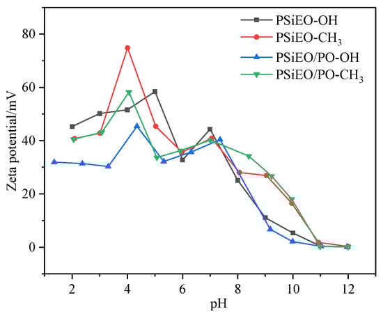 To determine the specific state of the four PSiEO/(PO)-OH(CH3) surfactants at different solution pH values, the zeta potential was measured under different pH conditions (surfactant concentration: 1 g L−1). The zeta potential indicates the stability of colloidal dispersion systems [21]. When the absolute value of the zeta potential is high, particles show mutual repulsion, and the dispersion is stable. When the absolute value of the zeta potential is low, particles show mutual attraction, resulting in aggregation or agglomeration; thus, the dispersion is unstable. Typically, dispersions with zeta potentials between 30 and −30 mV are unstable, whereas those with zeta potentials greater than 30 mV or less than −30 mV are stable [22].