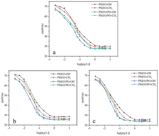 γ vs. logC curves of PSiEO/(PO)-OH(CH3) surfactants at (a) pH 3.0, (b) pH 7.0, and (c) pH 11.0.