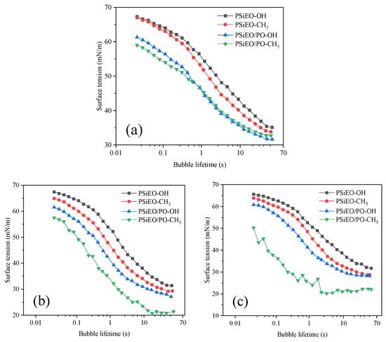 where γt is the surface tension at time t, Rcap is the radius of the capillary, and ΔPmax is the maximum pressure drop. The dynamic surface tensions of the PSiEO/(PO)-OH(CH3) surfactants (concentration: 2 g L−1) were measured using a dynamic surface tension meter at 25 ± 0.2 °C. The relationship between the surface tension and the bubble lifetime is shown in Figure 5.