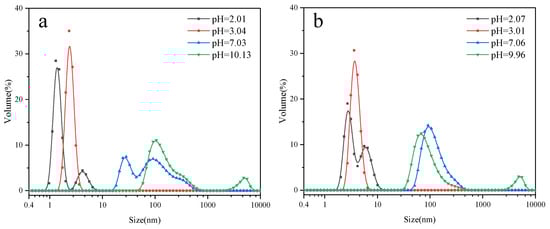 The zeta potentials of the four surfactants are shown in Figure 3 as a function of pH. Two peaks were observed at pH values of approximately 4 and 7. The first peak (pH 4) corresponded to the quaternization of some tertiary amino groups. The adsorption capacity of the solution interface gradually saturated with increasing pH, and minimum surface absorption area (Amin) of the micelles at the surface also increased. However, the size of the particles decreased. When the interface could not accommodate all the surfactant, the morphology of the surfactant particles began to change, leading to the formation of larger micelles or other forms of micelles.