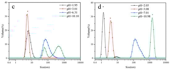 DLS of PSiEO/(PO)-OH(CH3) surfactant solutions at different pH values: (a) PSiEO-OH, (b) PSiEO-CH3, (c) PSiEO/PO-OH, and (d) PSiEO/PO-CH3.