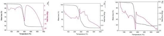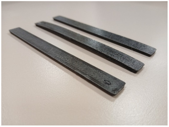 All samples have an addition of particulates, ceramic or metal, higher than 5%. Visually, there is a difference in the colour of the samples depending on the concentration of HA. The 20% HA–PLA (PLA–HA20) composite has a greenish-blue colour, and the 50% HA composite (PLA–HA50) is lighter blue. With respect to the influence of post-processing, no differences in texture, colour, shape or dimension were observed in the HA composites, before or after annealing [7]. However, it has been observed that the Mg composite samples, despite maintaining the same dimensions-texture-colour, bend when subjected to heat treatment. The curvature is more pronounced in the case of abrupt cooling (PLA–Mg10′) and lighter in the case of controlled cooling (PLA–Mg10″) (Figure 8).