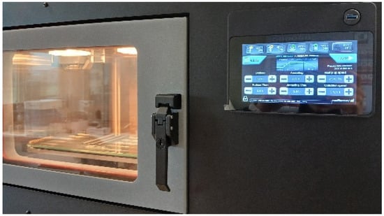 With respect to the post-processing of the specimens, this study evaluates three different conditions, which are called process 1, process 2 and process 3. Process 1 refers to the unprocessed sample. Process 2 refers to the sample annealed at a constant temperature, and cooled directly to room temperature. Finally, process 3 consists of maintained preheating to stabilise the sample for a given time, which is then heated progressively to the annealing temperature and, once annealed for the set time, a controlled cooling to room temperature is performed. For each post-processing condition, one specimen of each type and of each material is analysed. Some authors have found that prolonging the time or raising the annealing temperature does not have any effect on the matrix [30,31]. Moreover, considering that less than 60 min is needed to achieve 50% of the final crystallinity [17], the samples are subject to annealing for 2 h. Temperatures are chosen according to the thermal behaviour of each material provided by the manufacturer (Figure 4), and corroborated by studies carried out by other researchers [16,29,31]. Annealing is performed between the glass transition and melting temperature of each material [16]. First, the samples are analysed without any additional post-treatment steps by storing the samples at room temperature (23 °C–50% humidity) after printing (hereinafter referred to as PLA–HA20, PLA–HA50 and PLA–Mg10). Second, samples are subjected to constant annealing for 2 h with a temperature of 90 °C for PLA–HA, 70 °C for PLA–HA50 and 115 °C for PLA–Mg10 (hereon PLA–HA’, PLA–HA50′ and PLA–Mg10′, respectively), using the chamber of the Minifactory Ultra 2 (miniFactory Oy Ltd., Seinäjoki, Finland) as a conventional oven, and cooling to room temperature. Finally, the controlled annealing system of the Ultra 2 3D FDM printer (miniFactory Oy Ltd., Finland) (Figure 5) was used. For this process, it is worth mentioning that the material is, first of all, preheated for 30 min at 55 °C, then the temperature is raised up to the annealing temperature at a speed of 25 °C/h, to be annealed at the same conditions of 90 °C, 70 °C and 115 °C for 2 h for each of the above-mentioned materials (samples are called PLA–HA20″, PLA–HA50″ and PLA–Mg10″) and finally slowly cooled to room temperature at a rate of 5 °C/h. The annealing curves are shown in Figure 6. All specimens were stored under environmental conditions until they were mechanically tested.