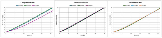 Due to the limitations of the load cell (max. 10 kN) used and given the thermoplastic character and geometry of the materials used, in no case has the yield and/or break limit been reached (Table 6, Figure 11). As a result, the compressive modulus (Ec) is defined as the slope of the straight line that fits the stress-strain curve in the linear region [2], whereas s1 is the compressive load at 1% of strain. In the case of composites formed by HA, in both cases it is observed that sudden annealing (PLA–HA20′ and PLA–HA50′) stiffens the material, increasing the Ec (16.2 MPa and 21.29 MPa, respectively), while controlled cooling (PLA–HA20″ and PLA–HA50″) softens the material (13.72 MPa and 16.37 MPa, respectively), so that for lower hardnesses there will be more deformation. On the other hand, for Mg composite, an increase in Ec after annealing is observed. Ec is 8.15% higher in the case of controlled annealing (PLA–Mg10″) versus sudden cooling (PLA–Mg10′), which is 8.16% higher than the specimen without post-processing. Therefore, the material PLA–Mg10 is stiffer after annealing, with an increase in compression strength [24].