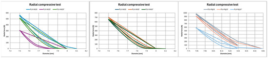 The last parameter analysed is the radial compressive strength of tubular specimens (Table 7, Figure 12). In the case of HA, it is observed that controlled annealing increases the compressive radial strength in both cases. For PLA–HA20, the supported radial force increases five times for the controlled annealing specimen (PLA–HA20″) and decreases slightly (11.66%) in the case of sudden cooling (PLA–HA20′). On the other hand, with respect to the sample with a higher percentage of HA, the supported radial force is increased by 8% with respect to PLA–HA50′ and by 31.46% with respect to PLA–HA50″. However, in the case of magnesium, the opposite is observed. The annealing decreases the supported radial strength, being the controlled annealing PLA–Mg10″ 39.68% less resistant and the abrupt annealing PLA–Mg10′ 6.42% less resistance than the reference PLA–Mg10.