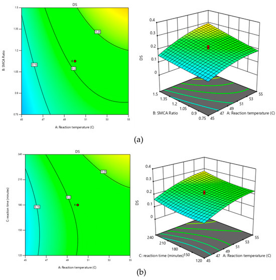 The linear effect of the SMCA/starch ratio on the degree of substitution (DS) is significant, along with the interactive effects between the reaction temperature and the SMCA/starch ratio, as well as between the SMCA/starch ratio and reaction time. A higher SMCA/starch ratio increases the SMCA concentration, leading to a higher DS (Figure 2a,c). These results were similar to previous studies reported by Hebeish and Khalil [21] and Bhattacharyya et al. [22]. In general, increasing the concentration of reactants leads to a higher reaction rate. This is because a greater number of particles within a given volume results in more frequent collisions between them. Since the reaction rate depends on the frequency of effective collisions among reactant molecules, higher concentrations typically accelerate the reaction [19]. The higher the reaction rate, the greater the DS.