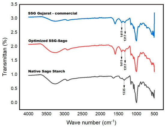 The FTIR spectra of native sago starch, optimized SSG sago, and SSG Gujarat.