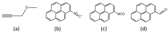 Possible QL agents (see text): (a) propargyl ether, (b) pyrene–isonitrile, (c) pyrene–isocyanate, (d) pyrene–aldehyde.