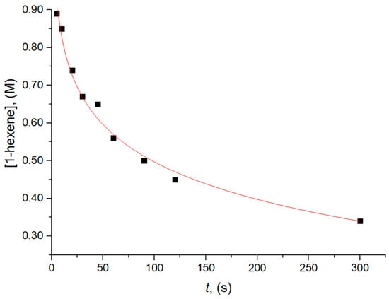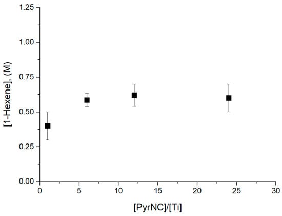 Its quenching ability was tested in a series of preliminary 1-hexene polymerization experiments in the presence of catalyst C1 at 40 °C and reaction time t = 90 s at a variable [PyrNC]/[Ti] molar ratio in the range of 1.0 to 24 (Table S1). We also performed quenching experiments at PyrNC/Ti > 24, but in this case, any attempt to completely remove the unreacted PyrNC failed. The UV signal of the labelled chains partially overlapped with the strong signal of the PyrNC, making the accurate x* determination not feasible. The reaction phases were characterized by 1H NMR spectroscopy to determine the concentration of unreacted 1-hexene (see Section 2). The results, reported in Figure 2, clearly indicated that the polymerization was effectively shut down at [PyrNC]/[Ti] ≥ 6.