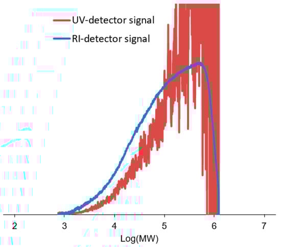 Overlay of MWD curves for a representative CQL poly(1-hexene) sample (#3 of Table 1) obtained by GPC with RI and UV-Vis detection (see text). For visualization purposes, the UV signal has been expanded vertically, and it is not on the same scale as the RI signal.