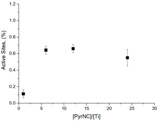 The polymer samples, coagulated with methanol and dried under vacuum (see Section 2), were characterized by GPC using both UV-Vis and RI detectors. As already noted in the Introduction, the RI detector measured the overall MWD, whereas the UV-Vis detector provided the MWD of the PyrNC-labeled chains only (Figure 3). The much lower signal-to-noise (S/N) ratio of the latter curve is a first qualitative indication of a low x* value. Consistently, quantitative integration of the UV-Vis signal yielded x* values in the range of 0.4–0.7%, independently of the [PyrNC]/[Ti] ratio (Figure 4). On the other hand, the overall MWD of the two curves turned out to be qualitatively similar, which indicates that quenching by PyrNC was almost unselective, notwithstanding the high polydispersity (Mw/Mn > 5) typical of Ti-ZN polyolefin samples. This is an important indication that the CQL method can be used with good confidence, not only for active sites count with molecular catalysts but also with heterogeneous Ti-ZN ones. The fact that the two traces are basically superimposable clearly indicates that the method is effectively labeling all Ti species bearing a polymeryl chain (irrespective of the regiochemistry of the last inserted monomeric unit) at the moment of quench.