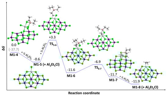 Models of adducts between adsorbed Ti(III) and AlR3-xClx species. Figure adapted from Ref. [38]. Color key: Cl in green, Mg in violet, Ti in light gray, Al in pink, C in dark gray, and H in light gray (small spheres).