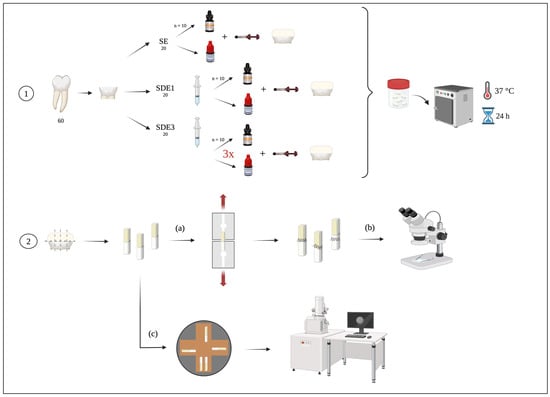 Experimental diagram of the laboratory procedure: 1—tooth preparation according to the three experimental groups; 2—sectioning of teeth into beams for (a) microtensile bond strength (μTBS) testing, (b) classification of failure modes after μTBS by observing the beams under a stereomicroscope, and (c) evaluation of the adhesive interface through observation of the beams using SEM.