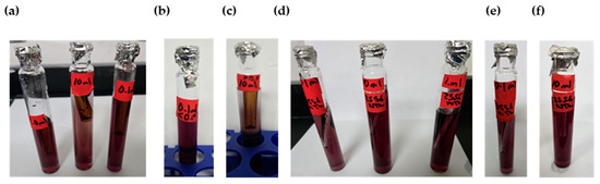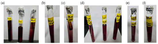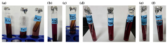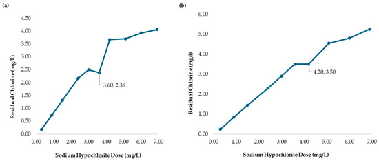 - Presence–absence (P–A) coliform test, EPA Method 9221(B) [30], was used to determine the coliform presence. For the control samples (sodium hypochlorite only), the jar analyzed corresponded to the breakpoint stage, and sample volumes of 0.1 mL, 1.0 mL, and 10 mL were added to the lactose broth. For the chitosan-treated samples, three stages were analyzed: the jar before the breakpoint (using 0.1 mL of sample), the jar at the breakpoint (using 0.1 mL, 1.0 mL, and 10 mL), and the jar after the breakpoint (using 10 mL of sample), all added to the lactose broth. Water samples were collected in sterile containers containing sodium thiosulfate to neutralize any residual chlorine. Each sample was inoculated into a P–A broth medium containing lactose (as a fermentable sugar), nutrient salts, bromocresol purple as a pH indicator, and a selective agent to inhibit non-coliform bacteria. The inoculated tubes were incubated at 35 ± 0.5 °C for 24–48 h. A positive result was indicated by a color change from purple (neutral pH) to yellow, due to acid production from lactose fermentation by coliform bacteria.