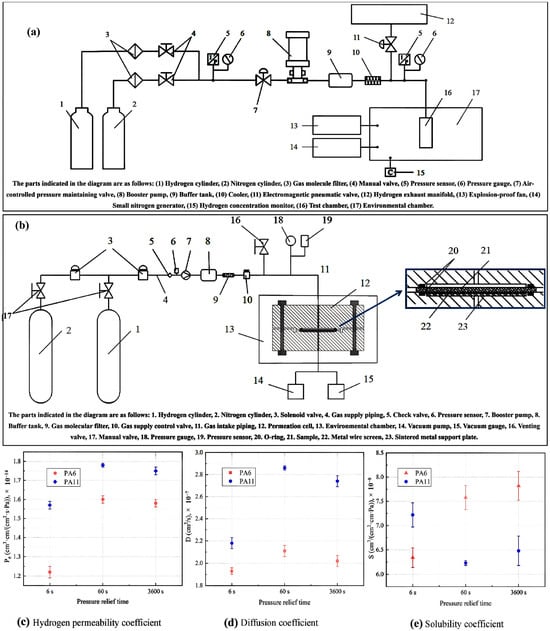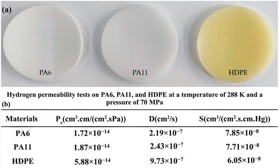 - Permeability coefficient: Compared to PE, PA6 exhibited superior resistance to hydrogen and better gas permeability, with its ability to prevent hydrogen gas permeation improving by three to four times. Additionally, the permeability coefficient of PE was more significantly influenced by temperature changes than that of PA6 (Figure 9d).