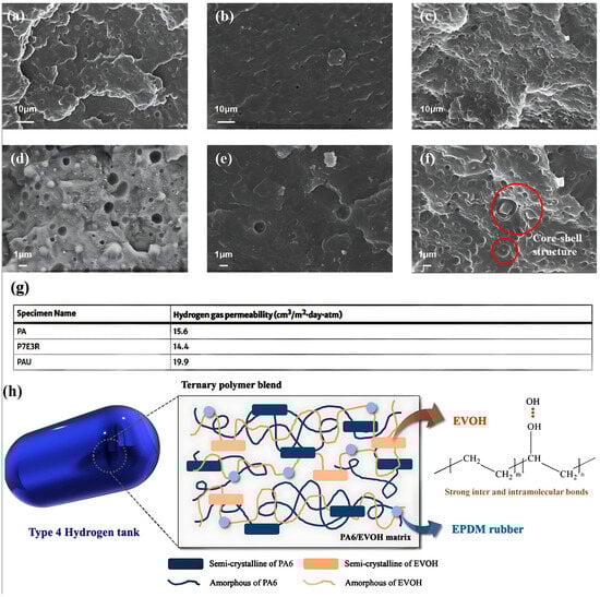 - Mechanism illustration: The enhanced gas barrier properties of the PA6/EVOH/EPDM ternary blends are attributed to several key structural features (Figure 3h). The semi-crystalline arrangement of the PA6/EVOH matrix contributed to a longer tortuous path for gas diffusion, effectively reducing its permeability. Moreover, the strong inter- and intramolecular interactions formed by the hydroxyl groups in EVOH enhanced the gas barrier performance of the material by restricting polymer chain movement. Additionally, the incorporation of EPDM rubber, which is characterized by its cold resistance, benefits the overall integrity and impact strength of the blend. EVOH also played a critical role in coating the EPDM particles, improving its miscibility and overall performance, and making the ternary blend system a promising candidate for hydrogen tank liner applications owing to its superior mechanical and gas barrier characteristics.