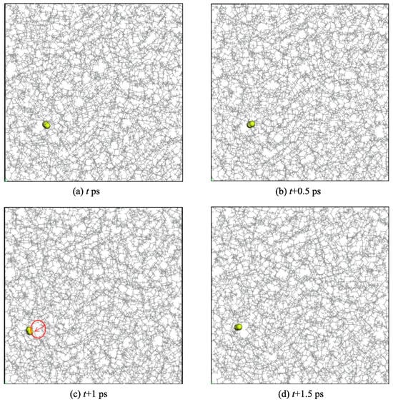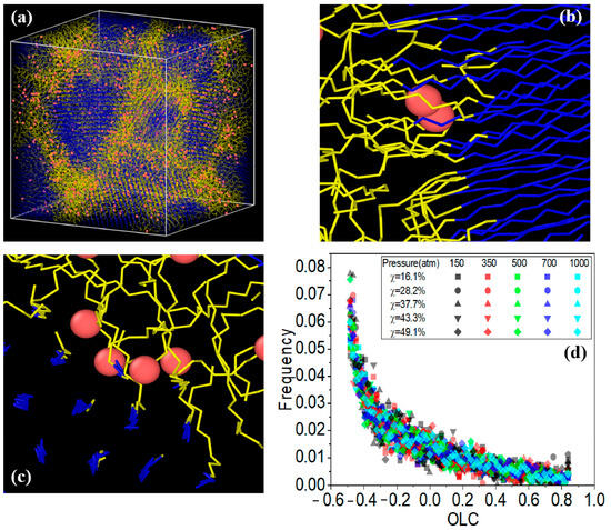 - Formation of bubbles during rapid pressure drops: Figure 19 presents the relationship between the changes in free volume (ΔFFV) for different components in a PE system containing 1000 H2 molecules. The solid line indicates ΔFFVmatrix, whereas the dashed line represents ΔFFVall. ΔFFVmatrix and ΔFFVall increase with the concentration of H2 (Figure 19a), suggesting the formation of voids during depressurization. The free volume distribution across simulations at 200, 300, and 400 K is shown in Figure 19b–d, respectively. As the temperature increases, ΔFFVall increases, with the distribution of free volume indicating that H2 molecules may aggregate, particularly at higher temperatures. This reinforces the trend that the H2 content within the PE matrix significantly impacts the free volume behavior and highlights the dynamic nature of H2 diffusion and aggregation under varying thermal conditions. To gain deeper insights into the behavior of the PE/H2 system during rapid depressurization, a 10 ns simulation was performed on a system comprising four branchless PE chains with a DP of 2000, containing 1000 H2 molecules, at a temperature of 400 K. Gas bubbles were initially detected at approximately 35 MPa but exhibited instability, appearing and disappearing at lower pressures (24, 16, and 8 MPa). At approximately 5 MPa, the bubbles began to expand, with the final sizes reaching 1–2 nm (Figure 20). These findings suggest that high-pressure conditions can lead to the formation of H2 nanobubbles in an oversaturated PE matrix, particularly if depressurization occurs too quickly for adequate diffusion to occur. Methods such as SAXS and XRD are recommended to analyze this phenomenon further.