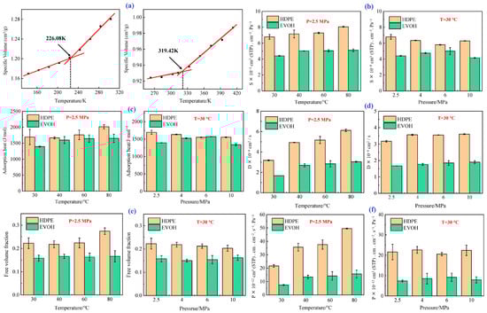 - Permeability coefficient: The permeability coefficient of H2 was higher in HDPE than in EVOH, reflecting similar trends in the diffusion and solubility coefficients (Figure 7f). Both materials showed significant increases in permeability upon increasing the temperature from 30 to 80 °C; the permeability of HDPE and EVOH increased by 129.0% and 112.7%, respectively. Pressure had a negligible effect on permeability, with variations from 2.5 to 10 MPa resulting in changes of only 3.7% and 7.5% for HDPE and EVOH, respectively. In low-pressure environments, the gas permeability is primarily dependent on temperature rather than pressure or gas concentration.