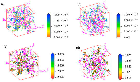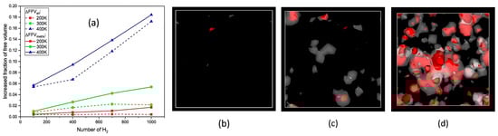 - Diffusion coefficient: The diffusion coefficient showed a positive correlation with FFV, with both parameters increasing as the temperature increased (Figure 9c). As the temperature increased, the free volume of the system expanded, thereby increasing the effective diffusion space available for H2 molecules. This heightened thermal motion of the molecular chains in PE and PA6, along with the H2 molecules, enhanced the likelihood of diffusion, which, in turn, increased the diffusion coefficient.