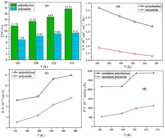 - Solubility coefficient: The solubility coefficients of hydrogen in PE and PA6 decreased as the temperature increased. Within the temperature range of 263–353 K, PE consistently demonstrated a higher solubility coefficient than PA6 (Figure 9b).