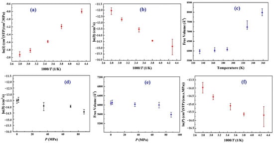- The gas diffusion in PA6 is affected by pressure. Five characteristic pressures (0.1, 2.0, 35.0, 70.0, and 87.5 MPa) were analyzed at 288 K (Figure 10d). The findings indicated a slight decrease in the diffusion coefficient as the pressure increased, with the coefficient at 87.5 MPa being only 40.70% of that at 0.1 MPa. This suggests that, although pressure influences gas diffusion, the effect is limited, particularly within a narrow pressure range. Additionally, increased pressure compacted the polymer, resulting in a reduced free volume and more strenuous gas diffusion (Figure 10e), a phenomenon referred to as the hydrostatic effect. The permeability coefficient was slightly reduced at a constant temperature, correlating with the changes in the diffusion and solubility coefficients.