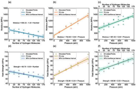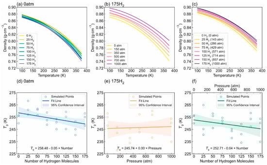 - Tg: Figure 12 illustrates the complex interplay between the hydrogen content, pressure, and the resulting density–temperature characteristics and Tg of the PE systems. As depicted in Figure 12a, increasing the hydrogen content at a constant pressure (0 atm) results in decreased density, contributing to enhanced free volume and segmental mobility of the polymer. Figure 12d shows a corresponding significant reduction in Tg, demonstrating a negative correlation attributed to the plasticizing effect of H2 molecules. Figure 12b reveals that under a constant hydrogen content (175 H2 molecules), increasing the pressure leads to an increase in density but does not significantly affect Tg, as indicated in Figure 12e, where the slope is effectively zero. Furthermore, the coupled effects illustrated in Figure 12c,f show that although the hydrogen content and pressure influence the density and Tg, the primary factor for Tg reduction remains hydrogen, with a slope of 0.04, highlighting that the plasticizing effect of hydrogen outweighs the compressive influence of pressure on Tg, thus underscoring the critical role of hydrogen in modulating the thermal properties of PE in high-pressure environments.