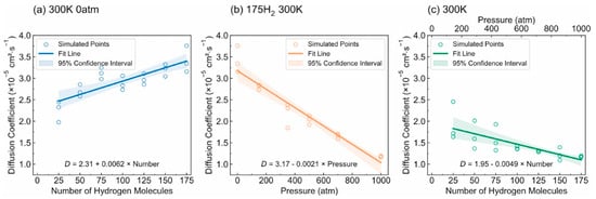 - Diffusivity: The results illustrated in Figure 13 offer important insights into the diffusion characteristics of PE at different hydrogen contents and pressures. Figure 13a reveals a positive relationship between the hydrogen content and diffusion coefficient at 0 atm pressure, suggesting that an increase in the number of H2 molecules enhances the diffusion capacity of PE. This enhancement is attributed to the plasticizing effect, which increases the free volume and improves chain mobility. Conversely, Figure 13b indicates that under a fixed content of 175 H2 molecules, increasing the pressure results in a significant decrease in the diffusion coefficient, with a negative regression coefficient, demonstrating that the applied pressure restricts the free volume, thereby hindering the mobility of H2 molecules within the PE matrix. Furthermore, the coupled effects illustrated in Figure 13c confirm that when the hydrogen content and pressure is increased, the overall diffusion coefficient decreases, indicating that the negative impact of pressure outweighs the positive contribution of the increased hydrogen content, leading to reduced diffusion rates in practical applications. As shown in Figure 14a, under tensile stress conditions at constant temperature (300 K) and pressure (1000 atm), the diffusion coefficients of hydrogen in PE exhibit a nuanced response to tensile stress, suggesting enhanced molecular mobility. Figure 14b reveals that the diffusion coefficients vary with temperature, further emphasizing that higher temperatures facilitate the increased diffusion of H2 molecules within the PE, thus illustrating how tensile stress and thermal conditions significantly affect hydrogen mobility in high-pressure scenarios.
